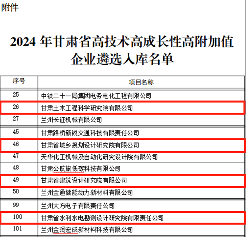近日,甘肅省科技廳公布2024年甘肅省高技術(shù)高成長性高附加值(簡稱“三高”)企業(yè)名單,甘肅工程咨詢集團(tuán)旗下省建筑設(shè)計院、省水電設(shè)計院、省城鄉(xiāng)規(guī)劃院、甘肅土木工程院從眾多企業(yè)中脫穎而出,成功登上全省首批“三高”企業(yè)榜單。