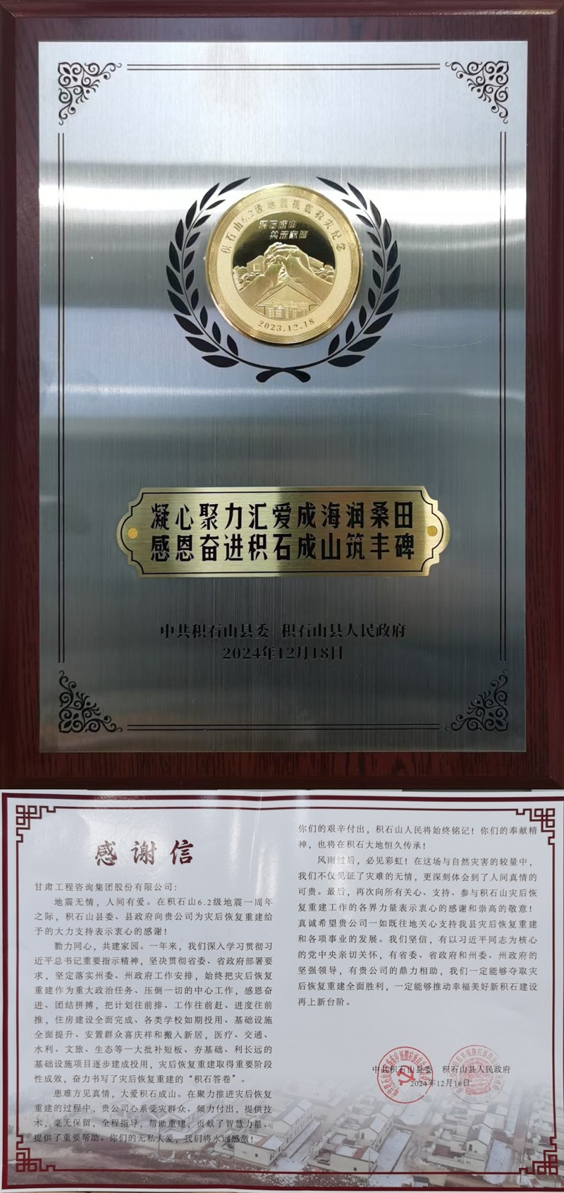 1月22日,時值北方農歷小年。中共積石山縣委、積石山縣人民政府為甘肅工程咨詢集團送來感謝信,對甘肅工程咨詢集團在災后恢復重建給予的大力支持表示感謝,并致以節日問候。