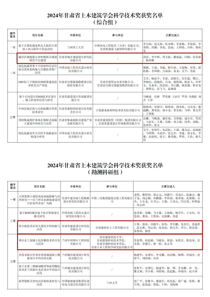 近日,2024年甘肅省土木建筑學會科學技術獎獲獎結果公布,甘肅工程咨詢集團斬獲多項榮譽。其中,省建筑設計院申報的《咬合樁技術在深大基坑中的創新與應用》項目榮獲“科學技術獎(勘測科研組)二等獎”,省城鄉規劃院申報的《城市區域地震災害模擬及規劃研發平臺建設》項目榮獲“科學技術獎(綜合組)二等獎”,土木工程院參與的《寒區水工混凝土抗沖磨技術的開發與應用》項目榮獲“科學技術獎(勘測科研組)三等獎”。省建筑設計院、省城鄉規劃院4人分別榮獲“科技貢獻獎”“科技英才獎”“科技貢獻獎”“優秀總工程師獎”等榮譽稱號。