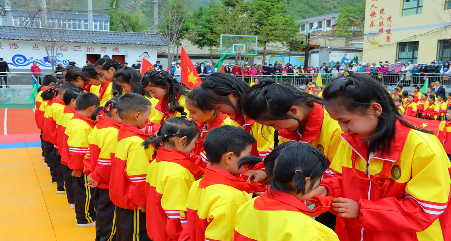 活動現場,在莊嚴激昂的國歌聲中舉行了升國旗儀式。簡單而又隆重的入隊儀式上,鮮紅的隊旗迎風飄揚,隨著入隊隊員名單的宣布,許多一年級的同學成為了光榮的中國少年先鋒隊隊員,并由高年級的少先隊員為他們戴上了鮮艷的紅領巾。隨后,大隊輔導員帶領新隊員宣誓,響亮的呼號聲“時刻準備著”響徹校園上空,集中展示了新時代少先隊員積極向上的精神風貌,全體師生為他們送上最深的祝福。最后,新隊員代表發言,標準的隊禮、堅定的眼神、稚嫩的聲音表達了最大的決心,號召全體新隊員要在星星火炬的指引下刻苦讀書,從小聽黨話、感黨恩、跟黨走,努力成長為中國特色社會主義事業建設者和接班人。