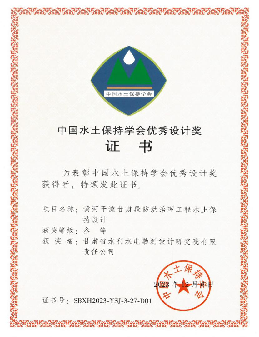 據悉,這是繼《甘肅省引洮供水一期工程水土保持設計》獲第三屆中國水土保持學術大會優秀設計二等獎后,再次喜獲此獎項。中國水土保持學術大會制度自2018年建立以來,中國水土保持學會搭建了我國水土保持領域規模最大、水平最高的學術交流平臺,現已成為中國水土保持學術交流的重要品牌。中國水土保持學會優秀設計獎每兩年評選一次,主要獎勵我國在水土保持規劃與設計領域中技術先進、成效顯著、理念創新的項目成果。